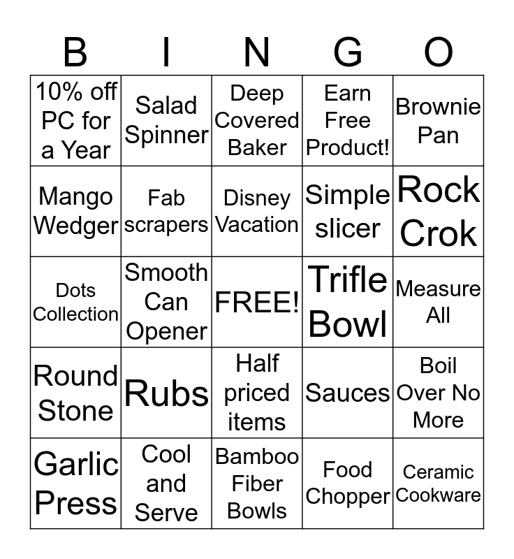 This bingo card has a free space and 24 words: Rubs, Cool and Serve, Disney Vacation, Garlic Press, Brownie Pan, 10% off PC for a Year, Mango Wedger, Salad Spinner, Trifle Bowl, Half priced items, Simple slicer, Dots Collection, Sauces, Boil Over No More, Fab scrapers, Food Chopper, Measure All, Deep Covered Baker, Rock Crok, Smooth Can Opener, Ceramic Cookware, Round Stone, Earn Free Product! and Bamboo Fiber Bowls.