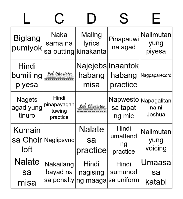 This bingo card has 2 images, a free space and 24 words: Nalate sa practice, Hindi sumunod sa uniform, Najejebs habang misa, Nakailang bayad na sa penalty, Nalimutan yung piyesa, Biglang pumiyok, Hindi bumili ng piyesa, Naka sama na sa outting, Napagalitan na ni Joshua, Hindi umattend ng practice, Inaantok habang practice, Nagets agad yung tinuro, Nalimutan yung voicing, Nalate sa misa, Hindi pinapayagan tuwing practice, Pinuri ni Joshua, Pinapauwi na agad, Kumain sa Choir loft, Maling lyrics kinakanta, Umaasa sa katabi, Nagpaparecord, Hindi nagising ng maaga, Napwesto sa tapat ng mic and Naglipsync.