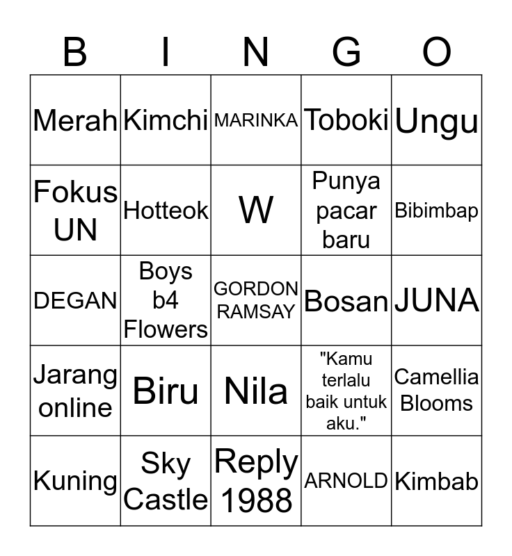 This bingo card has a free space and 24 words: Biru, Sky Castle, W, Kuning, Ungu, Merah, Fokus UN, Kimchi, Bosan, Nila, Punya pacar baru, DEGAN, "Kamu terlalu baik untuk aku.", Camellia Blooms, Hotteok, ARNOLD, JUNA, MARINKA, Bibimbap, Boys b4 Flowers, Kimbab, Jarang online, Toboki and Reply 1988.