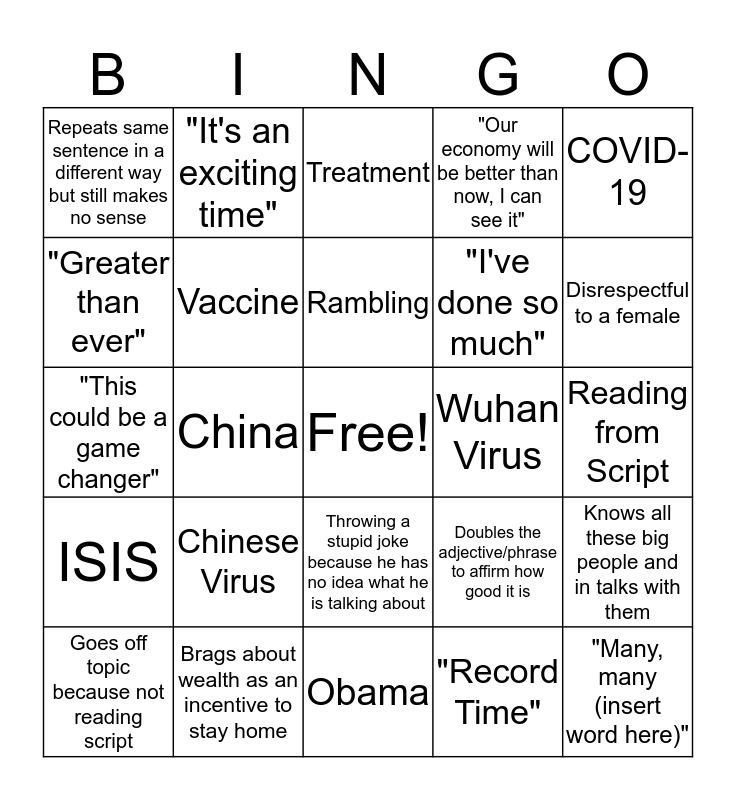 This bingo card has a free space and 24 words: Chinese Virus, Brags about wealth as an incentive to stay home, Rambling, Goes off topic because not reading script, COVID-19, Repeats same sentence in a different way but still makes no sense, "Greater than ever", "It's an exciting time", Wuhan Virus, Throwing a stupid joke because he has no idea what he is talking about, "I've done so much", "This could be a game changer", Doubles the adjective/phrase to affirm how good it is, Knows all these big people and in talks with them, Vaccine, "Record Time", Reading from Script, Treatment, Disrespectful to a female, China, "Many, many (insert word here)", ISIS, "Our economy will be better than now, I can see it" and Obama.