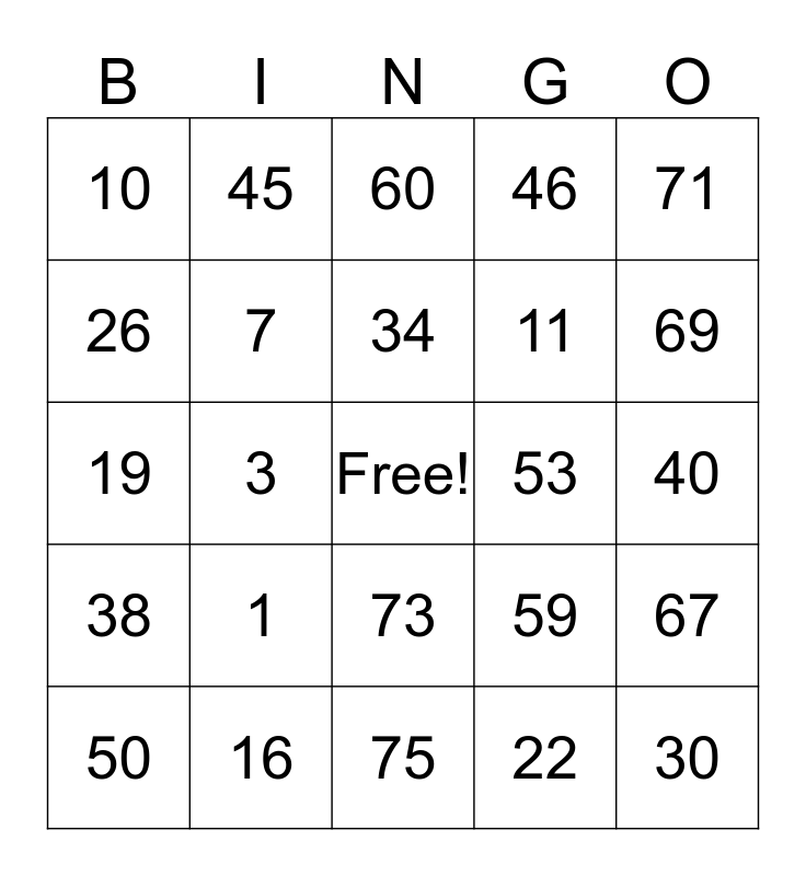 This bingo card has a free space and 24 words: 1, 16, 34, 50, 71, 10, 26, 45, 53, 73, 11, 19, 59, 67, 7, 22, 40, 60, 69, 3, 30, 38, 46 and 75.