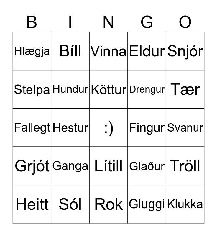 This bingo card has a free space and 24 words: Ganga, Sól, Köttur, Heitt, Snjór, Hlægja, Stelpa, Bíll, Fingur, Lítill, Drengur, Fallegt, Glaður, Tröll, Hundur, Gluggi, Svanur, Vinna, Tær, Hestur, Klukka, Grjót, Eldur and Rok.