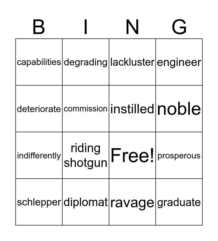 This bingo card has 21 words: diplomat, mouthing off, degrading, congested, ravage, instilled, capabilities, lackluster, Free!, noble, indifferently, engineer, graduate, advisor, commission, chairman, schlepper, riding shotgun, deteriorate, prosperous and African -American.