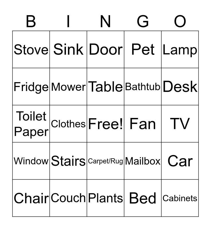 This bingo card has a free space and 24 words: Stairs, Couch, Table, Chair, Lamp, Stove, Fridge, Sink, Fan, Carpet/Rug, Bathtub, Toilet Paper, Mailbox, Car, Mower, Bed, TV, Door, Desk, Clothes, Cabinets, Window, Pet and Plants.