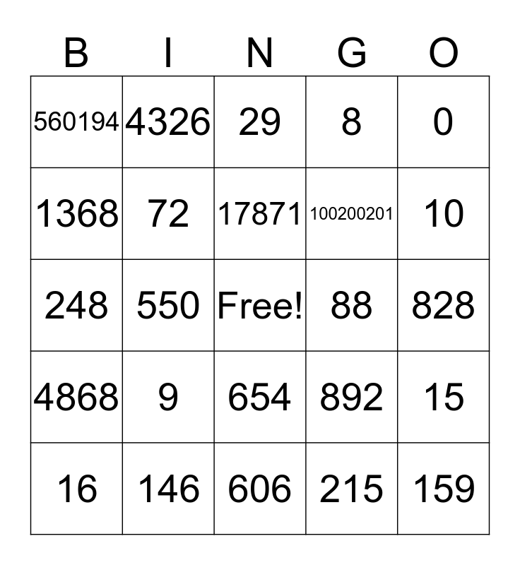 This bingo card has a free space and 24 words: 9, 146, 17871, 16, 0, 560194, 1368, 4326, 88, 654, 100200201, 248, 892, 15, 72, 215, 828, 29, 10, 550, 159, 4868, 8 and 606.