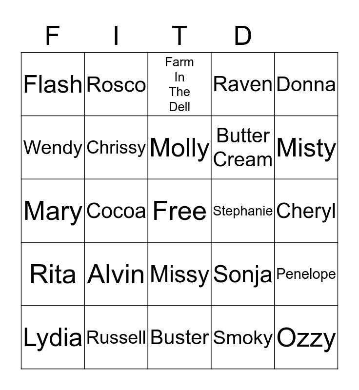 This bingo card has a free space and 24 words: Alvin, Russell, Molly, Lydia, Donna, Flash, Wendy, Rosco, Stephanie, Missy, Butter Cream, Mary, Sonja, Penelope, Chrissy, Smoky, Cheryl, Farm In The Dell, Misty, Cocoa, Ozzy, Rita, Raven and Buster.