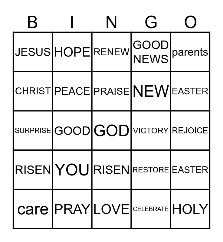 This bingo card has 25 words: RISEN, PRAY, GOD, CELEBRATE, parents, JESUS, HOPE, RENEW, VICTORY, EASTER, CHRIST, PEACE, LOVE, RESTORE, EASTER, care, GOOD, PRAISE, NEW, REJOICE, SURPRISE, YOU, RISEN, GOOD NEWS and HOLY.