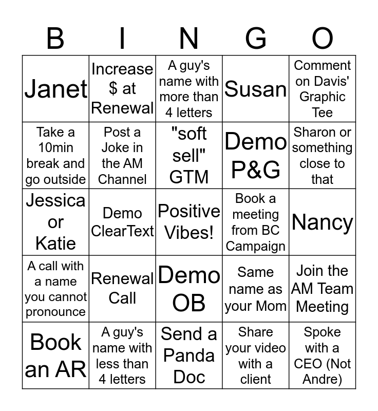 This bingo card has a free space and 24 words: Renewal Call, A guy's name with less than 4 letters, "soft sell" GTM, Book an AR, Comment on Davis' Graphic Tee, Janet, Take a 10min break and go outside, Increase $ at Renewal, Book a meeting from BC Campaign, Demo OB, Demo P&G, Jessica or Katie, Same name as your Mom, Join the AM Team Meeting, Post a Joke in the AM Channel, Share your video with a client, Nancy, A guy's name with more than 4 letters, Sharon or something close to that, Demo ClearText, Spoke with a CEO (Not Andre), A call with a name you cannot pronounce, Susan and Send a Panda Doc.