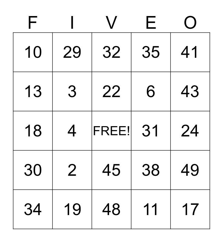 This bingo card has a free space and 24 words: 2, 19, 22, 34, 41, 10, 13, 29, 31, 45, 6, 18, 38, 49, 3, 11, 24, 32, 43, 4, 17, 30, 35 and 48.