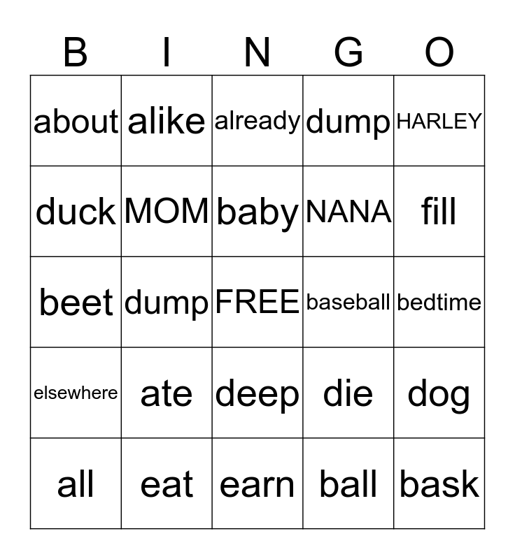 This bingo card has a free space and 24 words: all, ate, baby, ball, HARLEY, about, alike, already, baseball, bedtime, beet, MOM, die, dog, duck, eat, earn, dump, fill, elsewhere, dump, deep, NANA and bask.