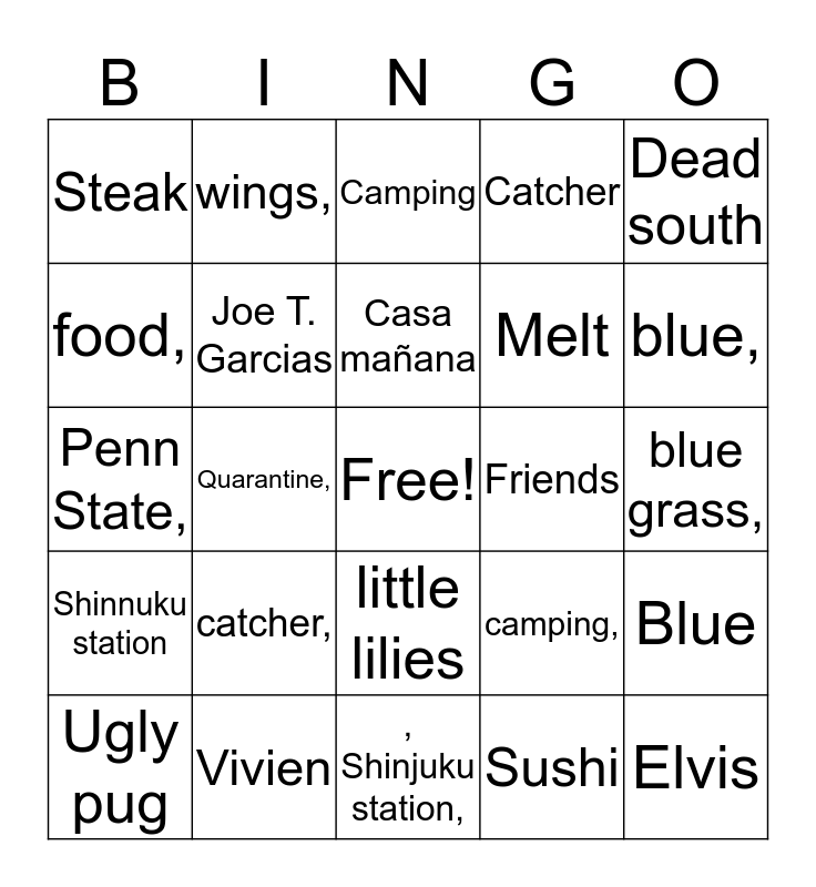 This bingo card has a free space and 58 words: Dallas blond, Vivien, Oreo, Shinnuku station, Sushi, Samuel Adams, Joe T. Garcias, Lonestar, Melt, Scarlett, Catcher, My sexy wife, Fried chicken, Corona-virus, Uni, Steak, Elvis, Dead south, Johnny cash, Casa mañana, Friends, Camping, Ugly pug, Blue, Coronavirus,, blue grass,, COVID-19,, ugly pug,, blue,, my sexy wife,, steak, Samuel Adams,, casa mañana,, uni, , Oreo,, Vivian,, fried chicken,, Quarantine,, Penn State,, ScarleTT,, catcher,, , Friends,, camping,, Elvis,, Johnny Cash,, Lonestar oyster bar,, Joe T Garcia‘s,, little lilies, , Shinjuku station,, Dead south,, melt,, football,, all saints,, Fort Worth club,, wings,, pizza,, food, and Dallas blonde,.