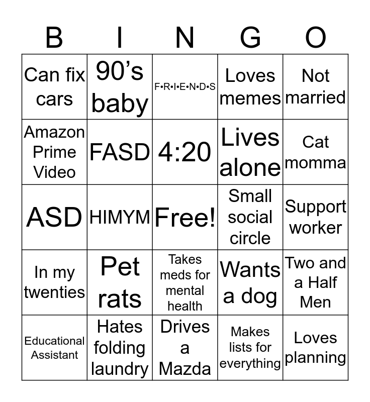 This bingo card has a free space and 25 words: Pet rats, Drives a Mazda, 4:20, Educational Assistant, Not married, Can fix cars, Amazon Prime Video, 90’s baby, Small social circle, Takes meds for mental health, Lives alone, ASD, Wants a dog, Two and a Half Men, FASD, No children, Support worker, F•R•I•E•N•D•S, Cat momma, HIMYM, Loves planning, Hates folding laundry, In my twenties, Loves memes and Makes lists for everything.