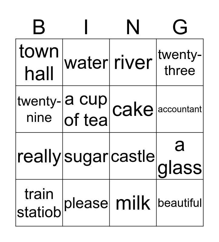 This bingo card has 32 words: coffee, nurse, a glass, bridge, beautiful, cake, twenty-nine, pensioner, water, is, accountant, river, church, engineer, please, juice, Here you are, castle, baker, garden, You are welcome, job, milk, to pass, train statiob, twenty-three, really, a cup of tea, town hall, this is, thirty and sugar.