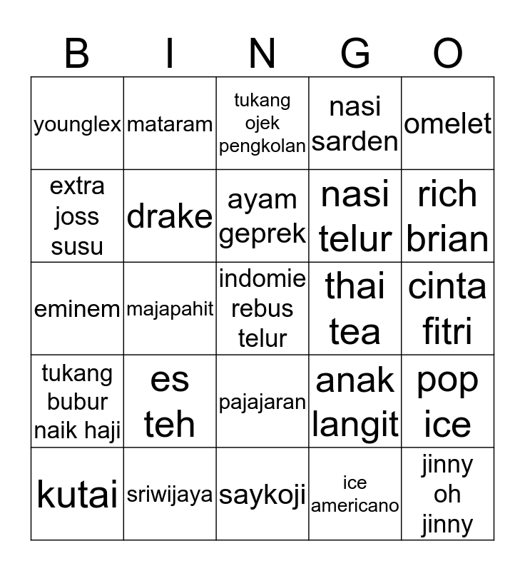This bingo card has a free space and 24 words: es teh, sriwijaya, ayam geprek, kutai, omelet, younglex, extra joss susu, mataram, thai tea, pajajaran, nasi telur, eminem, anak langit, pop ice, drake, ice americano, cinta fitri, tukang ojek pengkolan, rich brian, majapahit, jinny oh jinny, tukang bubur naik haji, nasi sarden and saykoji.