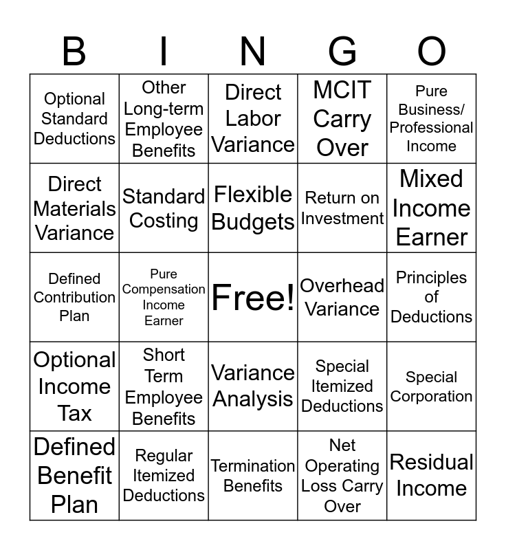 This bingo card has a free space and 24 words: Short Term Employee Benefits, Regular Itemized Deductions, Flexible Budgets, Defined Benefit Plan, Pure Business/ Professional Income, Optional Standard Deductions, Direct Materials Variance, Other Long-term Employee Benefits, Overhead Variance, Variance Analysis, Return on Investment, Defined Contribution Plan, Special Itemized Deductions, Special Corporation, Standard Costing, Net Operating Loss Carry Over, Principles of Deductions, Direct Labor Variance, Mixed Income Earner, Pure Compensation Income Earner, Residual Income, Optional Income Tax, MCIT Carry Over and Termination Benefits.