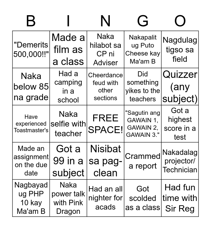 This bingo card has a free space and 24 words: Got a 99 in a subject, Naka power talk with Pink Dragon, Cheerdance feud with other sections, Nagbayad ug PHP 10 kay Ma'am B, Nagdulag tigso sa field, "Demerits 500,000!!", Naka below 85 na grade, Made a film as a class, "Sagutin ang GAWAIN 1, GAWAIN 2, GAWAIN 3.", Nisibat sa pag-clean, Did something yikes to the teachers, Have experienced Toastmaster's, Crammed a report, Nakadalag projector/ Technician, Had a camping in a school, Got scolded as a class, Got a highest score in a test, Naka hilabot sa CP ni Adviser, Quizzer (any subject), Naka selfie with teacher, Had fun time with Sir Reg, Made an assignment on the due date, Nakapalit ug Puto Cheese kay Ma'am B and Had an all nighter for acads.