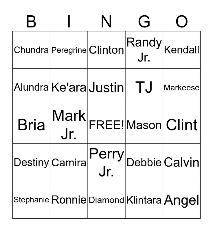This bingo card has a free space and 24 words: Camira, Ronnie, Justin, Stephanie, Kendall, Chundra, Alundra, Peregrine, Mason, Perry Jr., TJ, Bria, Debbie, Calvin, Ke'ara, Klintara, Clint, Clinton, Markeese, Mark Jr., Angel, Destiny, Randy Jr. and Diamond.