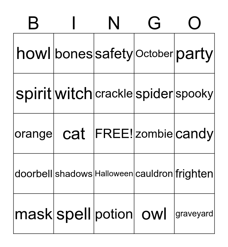 This bingo card has a free space and 24 words: shadows, spell, crackle, mask, party, howl, spirit, bones, zombie, Halloween, spider, orange, cauldron, frighten, witch, owl, candy, safety, spooky, cat, graveyard, doorbell, October and potion.