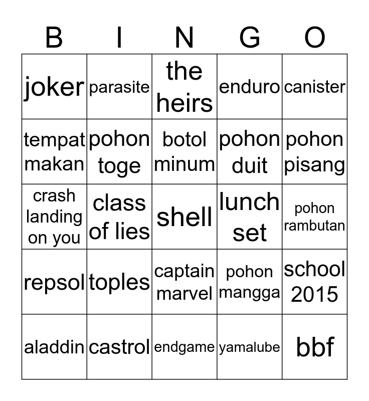 This bingo card has 25 words: toples, endgame, botol minum, aladdin, canister, joker, tempat makan, parasite, lunch set, captain marvel, pohon duit, crash landing on you, pohon mangga, school 2015, pohon toge, bbf, pohon rambutan, the heirs, pohon pisang, class of lies, shell, castrol, repsol, enduro and yamalube.
