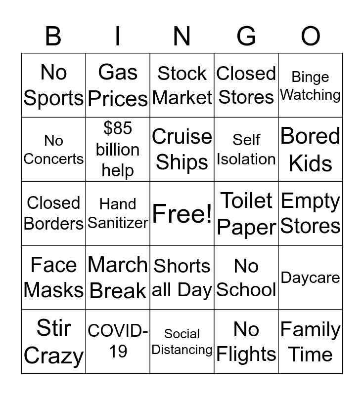 This bingo card has a free space and 24 words: March Break, COVID-19, Cruise Ships, Stir Crazy, Binge Watching, No Sports, No Concerts, Gas Prices, Toilet Paper, Shorts all Day, Self Isolation, Closed Borders, No School, Daycare, $85 billion help, No Flights, Empty Stores, Stock Market, Bored Kids, Hand Sanitizer, Family Time, Face Masks, Closed Stores and Social Distancing.
