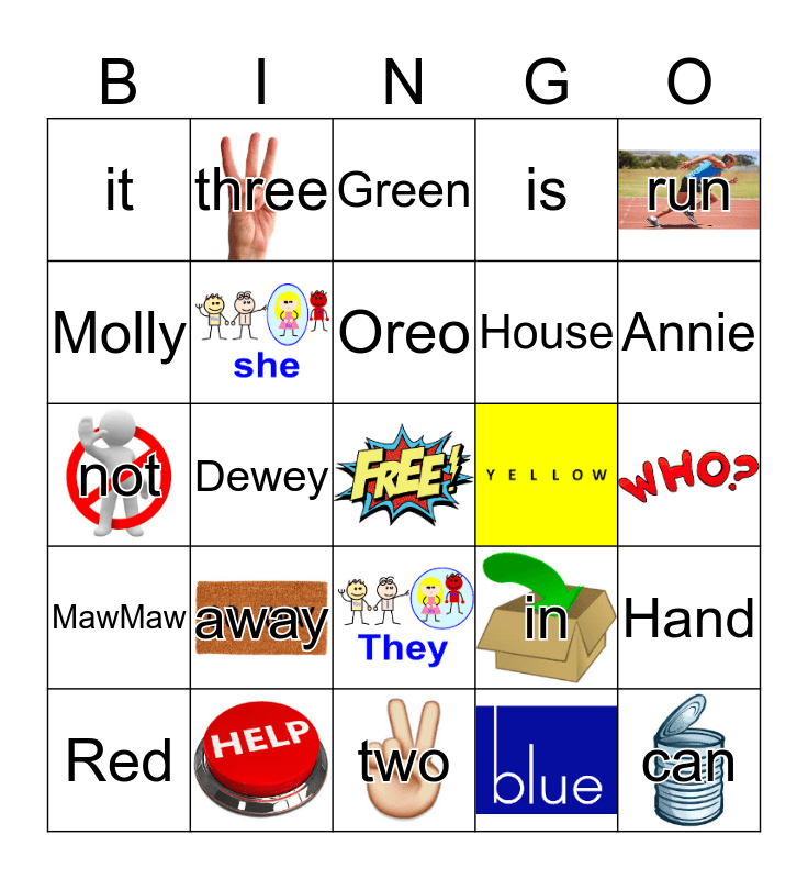 This bingo card has 21 images, a free space and 32 words: come, away, there, is, can, it, in, two, not, three, and, run, Mommy, Daddy, Oreo, Leroy, Hand, Red, Orange, Green, One, Grandpa, MawMaw, Mimi, PopPop, Rusty, Annie, Molly, Dewey, Farm, House and RTV.