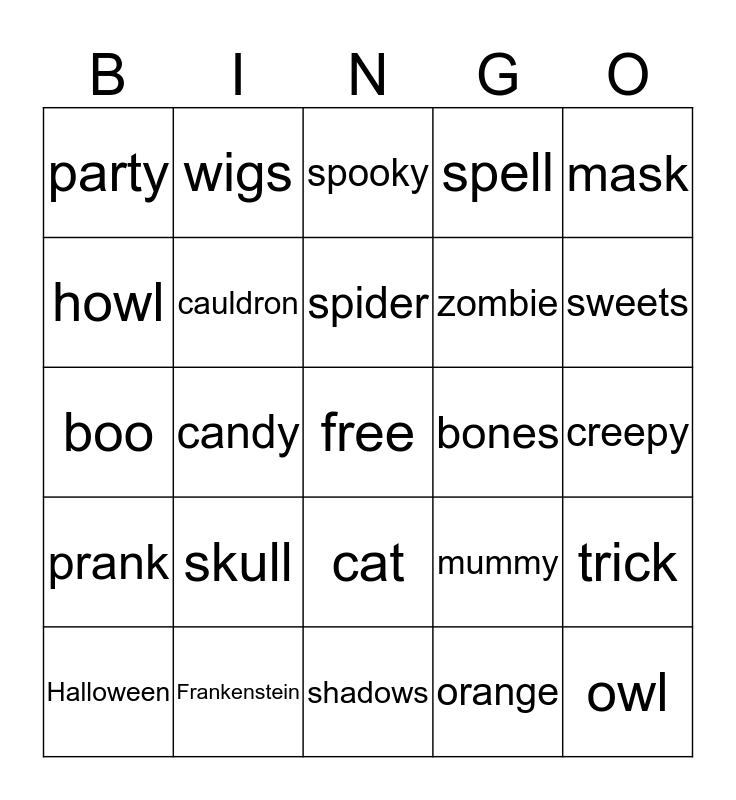 This bingo card has a free space and 24 words: skull, Frankenstein, spider, Halloween, mask, party, howl, wigs, bones, cat, zombie, boo, mummy, trick, cauldron, orange, creepy, spooky, sweets, candy, owl, prank, spell and shadows.
