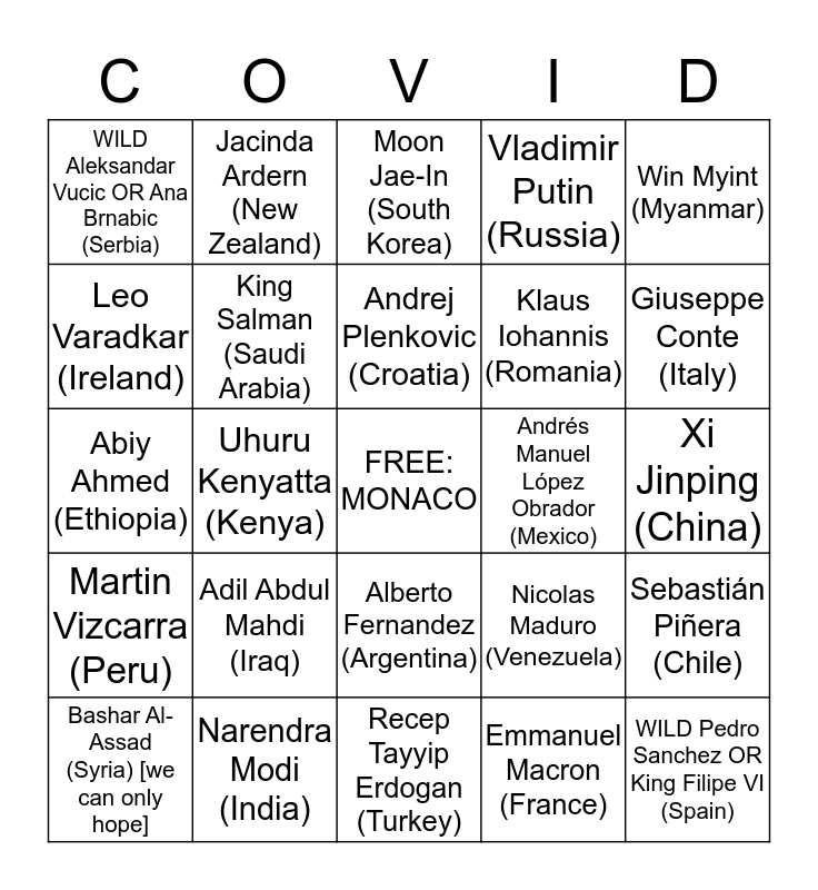 This bingo card has a free space and 86 words: Abdelmadjid Tebboune (Algeria), João Lourenço (Angola), Alberto Fernandez (Argentina), Scott Morrison (Australia), Sebastian Kurz (Austria), Ilham Aliyev (Azerbaijan), Sheikh Hasina (Bangladesh), Alexander Lukashenko (Belarus), Sophie Wilmès (Belgium), Jair Bolsonaro (Brazil), Boyko Borisov (Bulgaria), Justin Trudeau (Canada), Sebastián Piñera (Chile), Xi Jinping (China), Ivan Duque (Colombia), Andrej Plenkovic (Croatia), Raul Castro (Cuba), Andrej Babiš (Czech Republic), Mette Frederiksen (Denmark), Danilo Medina (Dominican Republic), Lenin Moreno (Ecuador), Abdel Fattah El-Sisi (Egypt), Abiy Ahmed (Ethiopia), Sanna Marin (Finland), Emmanuel Macron (France), Angela Merkel (Germany), Nana Akufo-Addo (Ghana), Kyriakos Mitsotakis (Greece), Alejandro Giammattei (Guatemala), Viktor Orban (Hungary), Narendra Modi (India), Joko Widodo (Indonesia), Ali Khamenei (Iran), Adil Abdul Mahdi (Iraq), Leo Varadkar (Ireland), Benjamin Netanyahu (Israel), Giuseppe Conte (Italy), Shinzo Abe (Japan), Qasym-Zhomart Toqaev (Kazakhstan), Uhuru Kenyatta (Kenya), Sheikh Sabah Al-Ahmad Al-Jaber Al-Sabah (Kuwait), Fayez Al-Sarraj (Libya), Muhyiddin Yassin (Malaysia), Andrés Manuel López Obrador (Mexico), Mohammed VI (Morocco), Win Myint (Myanmar), Mark Rutte (Netherlands), Jacinda Ardern (New Zealand), Muhammadu Buhari (Nigeria), Erna Solberg (Norway), Haitham Bin Tariq (Oman), Imran Khan (Pakistan), Martin Vizcarra (Peru), Rodrigo Duterte (Philippines), Mateusz Morawiecki (Poland), Antonio Costa (Portugal), Sheikh Tamim Bin Hamad Al Thani (Qatar), Klaus Iohannis (Romania), Vladimir Putin (Russia), King Salman (Saudi Arabia), WILD Aleksandar Vucic OR Ana Brnabic (Serbia), Lee Hsien Loong (Singapore), Peter Pellegrini (Slovakia), Manasseh Sogavare (Solomon Islands), Cyril Ramaphosa (South Africa), Moon Jae-In (South Korea), Salva Kiir Mayardit (South Sudan), WILD Pedro Sanchez OR King Filipe VI (Spain), Gotabaya Rajapaksa (Sri Lanka), Abdel Fattah Al-Burhan (Sudan), Stefan Lofven (Sweden), ... Switzerland? NEUTRAL. ANY Head of State not on your card, Bashar Al-Assad (Syria) [we can only hope], John Magufuli (Tanzania), Prayut Chan-O-Cha (Thailand), Kais Saied (Tunisia), Recep Tayyip Erdogan (Turkey), Garbanguly Berdimuhamedow (Turkmenistan), Volodymyr Zeleksy (Ukraine), Sheikh Khalifa Bin Zayed Al Nahyan (U.A.E.), Donald Trump (USA), WILD Queen Elizabeth, Prince Charles OR Boris Johnson (UK), Shavkat Zirziyoyev (Uzbekistan), Pope Francis (Vatican City), Nicolas Maduro (Venezuela) and Nguyen Phu Trong (Vietnam).