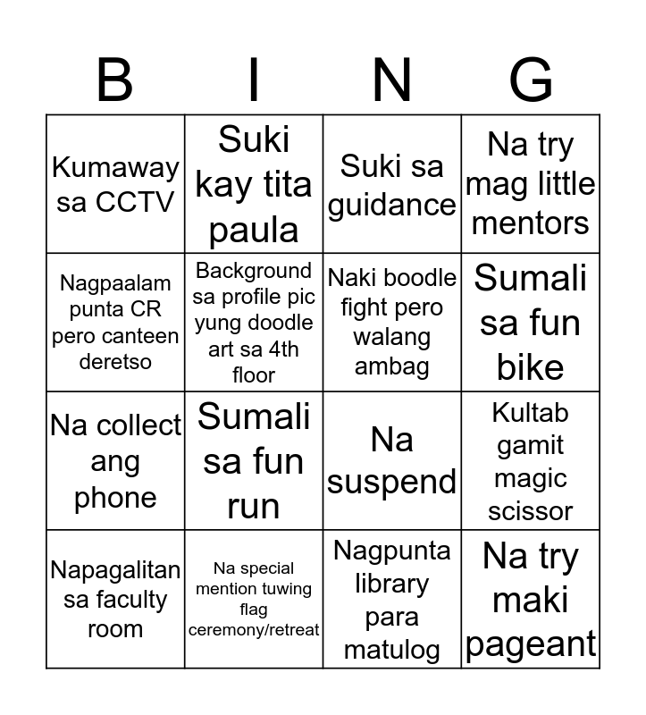 This bingo card has 16 words: Na special mention tuwing flag ceremony/retreat, Kultab gamit magic scissor, Suki sa guidance, Kumaway sa CCTV, Na collect ang phone, Suki kay tita paula, Na suspend, Nagpunta library para matulog, Nagpaalam punta CR pero canteen deretso, Background sa profile pic yung doodle art sa 4th floor, Napagalitan sa faculty room, Na try mag little mentors, Sumali sa fun run, Sumali sa fun bike, Naki boodle fight pero walang ambag and Na try maki pageant.