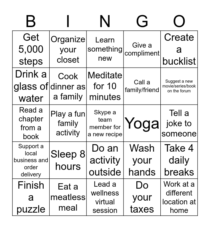 This bingo card has 25 words: Sleep 8 hours, Lead a wellness virtual session, Meditate for 10 minutes, Finish a puzzle, Create a bucklist, Get 5,000 steps, Drink a glass of water, Organize your closet, Yoga, Do an activity outside, Call a family/friend, Read a chapter from a book, Wash your hands, Take 4 daily breaks, Cook dinner as a family, Work at a different location at home, Tell a joke to someone, Learn something new, Suggest a new movie/series/book on the forum, Play a fun family activity, Skype a team member for a new recipe, Eat a meatless meal, Support a local business and order delivery, Give a compliment and Do your taxes.