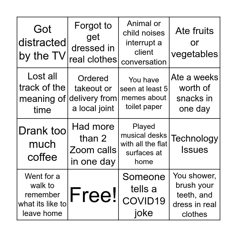 This bingo card has 16 words: Free!, Technology Issues, Animal or child noises interrupt a client conversation, Got distracted by the TV, Drank too much coffee, Forgot to get dressed in real clothes, Played musical desks with all the flat surfaces at home, Someone tells a COVID19 joke, Lost all track of the meaning of time, Ordered takeout or delivery from a local joint, Went for a walk to remember what its like to leave home, Ate fruits or vegetables, Had more than 2 Zoom calls in one day, Ate a weeks worth of snacks in one day, You have seen at least 5 memes about toilet paper and You shower, brush your teeth, and dress in real clothes.