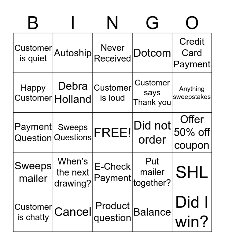 This bingo card has a free space and 33 words: Happy customer, Angry Customer, Sweeps Questions, Sweeps entry, Sweeps mailer, Debra Holland, Credit Card Payment, Customer is chatty, Autoship, Balance, Customer is loud, Never Received, Transfer, Scam call, Did not order, Anything sweepstakes, Cancel, Payment Question, When’s the next drawing?, Put mailer together?, E-Check Payment, 3rd party contact, Customer is quiet, Offer 50% off coupon, Product question, Did I win?, Dotcom, Customer says Thank you, Happy Customer, SHL, Did not order saved, Balance and Payment Explanation.