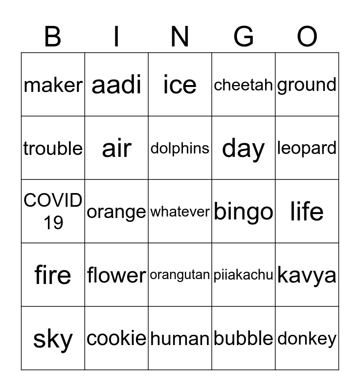 This bingo card has a free space and 24 words: flower, cookie, dolphins, sky, ground, maker, trouble, aadi, bingo, orangutan, day, COVID 19, piiakachu, kavya, air, bubble, life, ice, leopard, orange, donkey, fire, cheetah and human.