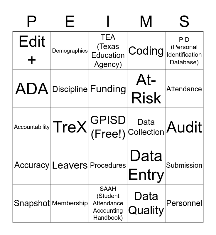 PEIMS Bingo Card | PEIMS Bingo Card | PEIMS Bingo Card | Staff Meeting Bingo | Title I Family Night