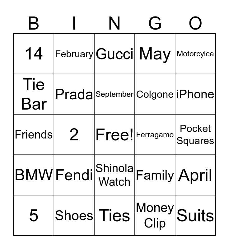 This bingo card has a free space and 29 words: 5, 26, 2, 18, 14, Gucci, Prada, Fendi, Ferragamo, Shoes, Pocket Squares, Suits, Ties, Money Clip, iPhone, iWatch, Shinola Watch, BMW, Motorcylce, Friends, Family, iPad, Colgone, Tie Bar, May, February, April, September and Ritz Carlton.