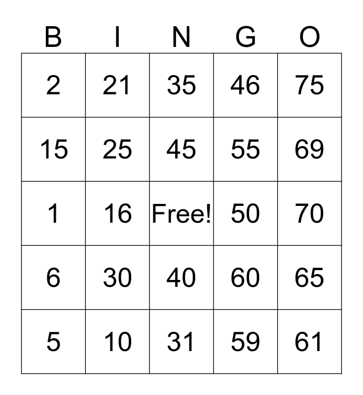 This bingo card has a free space and 24 words: 5, 30, 45, 59, 75, 2, 21, 35, 50, 70, 1, 25, 60, 65, 15, 10, 31, 46, 69, 6, 16, 40, 55 and 61.