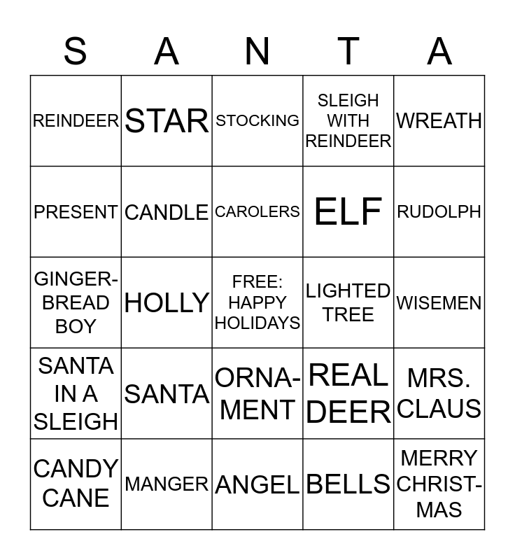 This bingo card has a free space and 24 words: SANTA, MANGER, CAROLERS, CANDY CANE, WREATH, REINDEER, PRESENT, STAR, LIGHTED TREE, ORNA-MENT, ELF, GINGER-BREAD BOY, REAL DEER, MRS. CLAUS, CANDLE, BELLS, WISEMEN, STOCKING, RUDOLPH, HOLLY, MERRY CHRIST-MAS, SANTA IN A SLEIGH, SLEIGH WITH REINDEER and ANGEL.