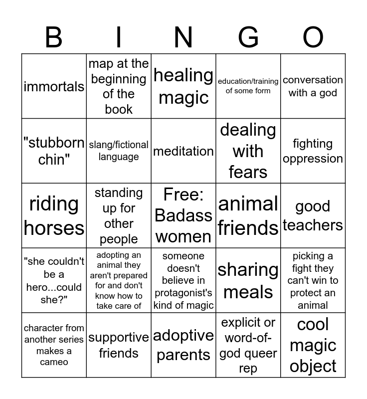 This bingo card has a free space and 24 words: adopting an animal they aren't prepared for and don't know how to take care of, supportive friends, meditation, character from another series makes a cameo, conversation with a god, immortals, "stubborn chin", map at the beginning of the book, animal friends, someone doesn't believe in protagonist's kind of magic, dealing with fears, riding horses, sharing meals, picking a fight they can't win to protect an animal, slang/fictional language, explicit or word-of-god queer rep, good teachers, healing magic, fighting oppression, standing up for other people, cool magic object, "she couldn't be a hero...could she?", education/training of some form and adoptive parents.