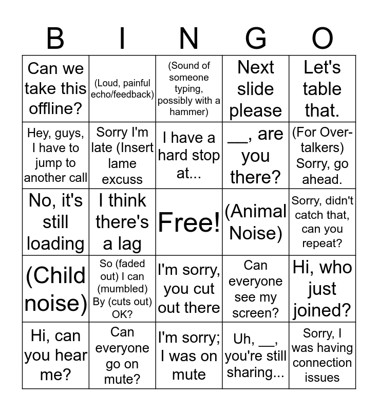 This bingo card has a free space and 28 words: Hi, who just joined?, Can you email that to everyone, __, are you there?, Uh, __, you're still sharing..., Hey, guys, I have to jump to another call, (Sound of someone typing, possibly with a hammer), (Loud, painful echo/feedback), (Child noise), (Animal Noise), Hi, can you hear me?, No, it's still loading, Next slide please, Can everyone go on mute?, I'm sorry; I was on mute, (For Over-talkers) Sorry, go ahead., Hello? ... Hello?, So (faded out) I can (mumbled) By (cuts out) OK?, Sorry I'm late (Insert lame excuss, I have a hard stop at..., I'm sorry, you cut out there, Can we take this offline?, I'll have to get back to you, Sorry, I was having connection issues, I think there's a lag, Sorry, didn't catch that, can you repeat?, Can everyone see my screen?, Let's table that. and Can you speak up? I can't hear you.