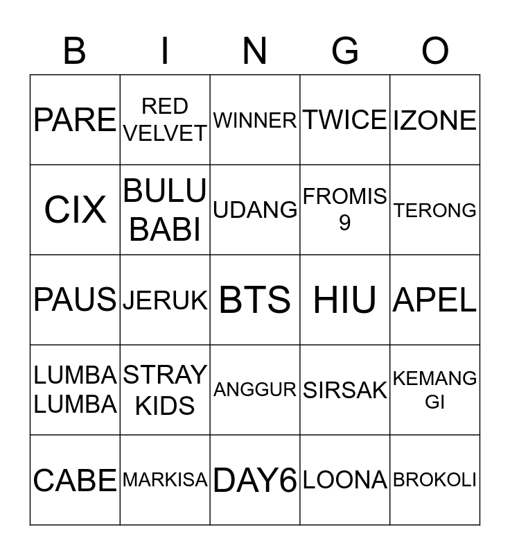 This bingo card has a free space and 24 words: STRAY KIDS, MARKISA, UDANG, CABE, IZONE, PARE, CIX, RED VELVET, HIU, ANGGUR, FROMIS 9, PAUS, SIRSAK, KEMANG GI, BULU BABI, LOONA, APEL, WINNER, TERONG, JERUK, BROKOLI, LUMBA LUMBA, TWICE and DAY6.