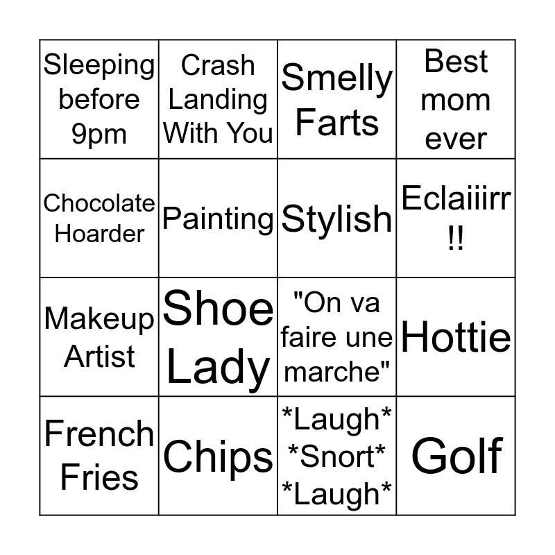 This bingo card has 23 words: Golf, Wine, Eclaiiirr !!, Dancing Queen, Chocolate Hoarder, Sleeping before 9pm, Painting, Crash Landing With You, French Fries, OCD, Shoe Lady, Makeup Artist, Tequila Tequila Tequila, Was Black In Past Life, Chips, Lame TV Shows, Smelly Farts, "On va faire une marche", Stylish, Hottie, Best mom ever, *Laugh* *Snort* *Laugh* and Shopping.