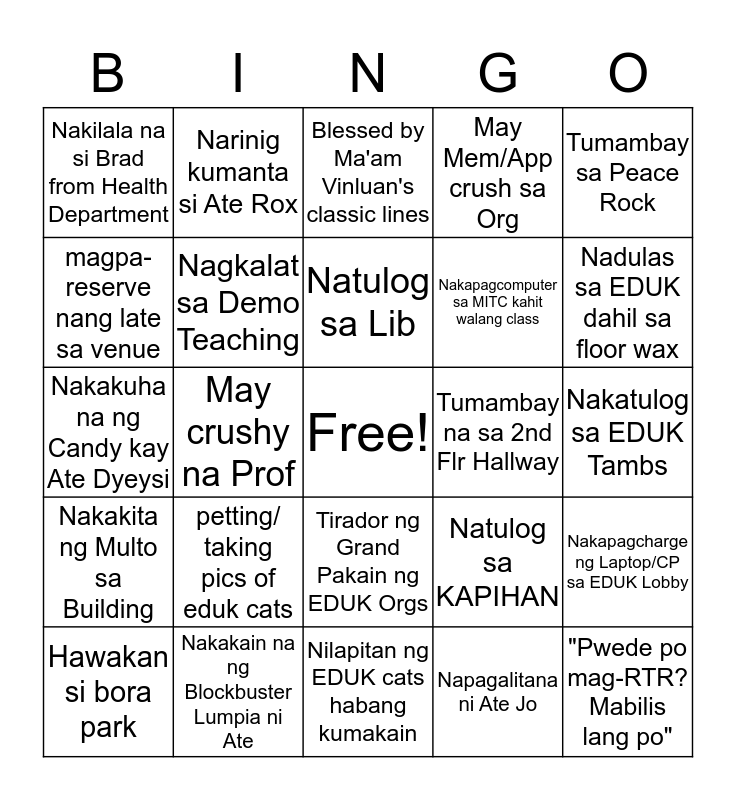 This bingo card has a free space and 24 words: petting/ taking pics of eduk cats, Nakakain na ng Blockbuster Lumpia ni Ate, Natulog sa Lib, Hawakan si bora park, Tumambay sa Peace Rock, Nakilala na si Brad from Health Department, magpa-reserve nang late sa venue, Narinig kumanta si Ate Rox, Tumambay na sa 2nd Flr Hallway, Tirador ng Grand Pakain ng EDUK Orgs, Nakapagcomputer sa MITC kahit walang class, Nakakuha na ng Candy kay Ate Dyeysi, Natulog sa KAPIHAN, Nakapagcharge ng Laptop/CP sa EDUK Lobby, Nagkalat sa Demo Teaching, Napagalitana ni Ate Jo, Nakatulog sa EDUK Tambs, Blessed by Ma'am Vinluan's classic lines, Nadulas sa EDUK dahil sa floor wax, May crushy na Prof, "Pwede po mag-RTR? Mabilis lang po", Nakakita ng Multo sa Building, May Mem/App crush sa Org and Nilapitan ng EDUK cats habang kumakain.