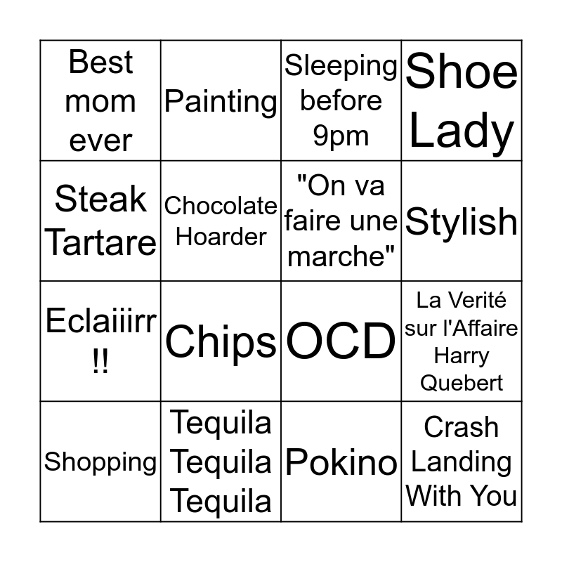This bingo card has 28 words: Golf, Wine, Eclaiiirr !!, Dancing Queen, Chocolate Hoarder, Sleeping before 9pm, Painting, Crash Landing With You, Tequila Tequila Tequila, French Fries, OCD, Shoe Lady, Makeup Artist, Was Black In Past Life, Chips, Lame TV Shows, Smelly Farts, "On va faire une marche", Stylish, Hottie, Best mom ever, *Laugh* *Snort* *Laugh*, Shopping, La Verité sur l'Affaire Harry Quebert, Pokino, Bon Marché, Steak Tartare and Yoga.