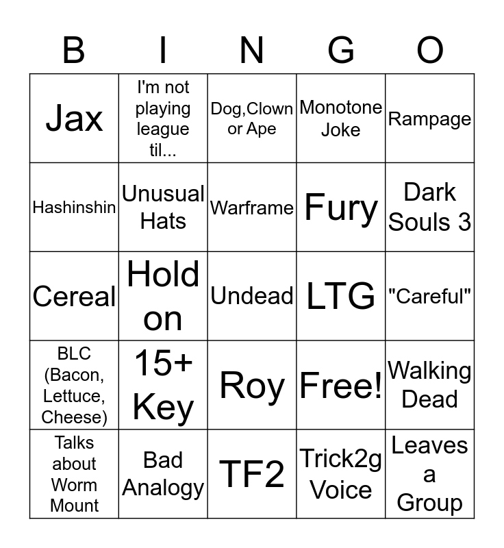 This bingo card has 25 words: 15+ Key, TF2, Warframe, Talks about Worm Mount, Rampage, Jax, Hashinshin, I'm not playing league til..., LTG, Roy, Fury, Cereal, Free!, Walking Dead, Unusual Hats, Leaves a Group, "Careful", Dog,Clown or Ape, Dark Souls 3, Hold on, Undead, Bad Analogy, BLC (Bacon, Lettuce, Cheese), Monotone Joke and Trick2g Voice.