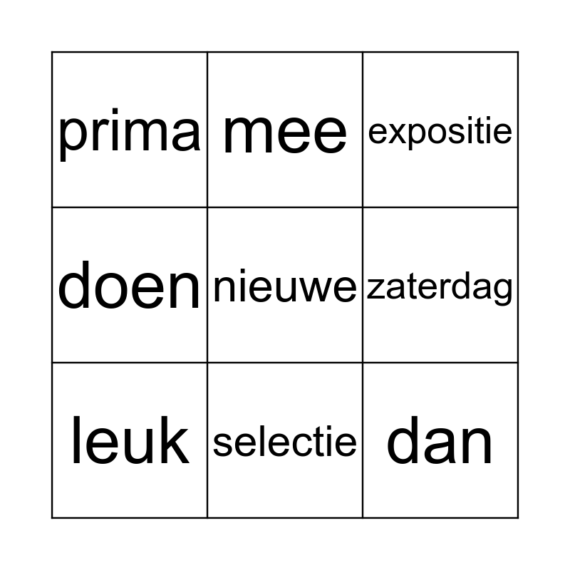 This bingo card has a free space and 8 words: zaterdag, expositie, mee, leuk, prima, dan, doen and selectie.