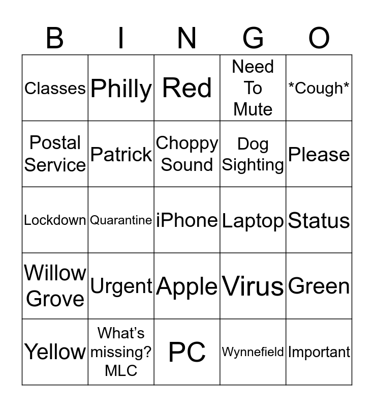 This bingo card has 58 words: Free!, What’s missing? MLC, KNE, Willow Grove, Wynnefield, Germantown, Patrick, Firewall, Dog Sighting, Cat Sighting, Need To Mute, Forget To Unmute, Skype for Business, Ipad, Chromebook, Classes, iPhone, *Cough*, Who Is Here?, Choppy Sound, Laptop, Red, Yellow, Green, Voicemail, Status, Thank You, Follow Up, Please, Email, Child Sighting, Therapy, Head of Household, Instruments, CDC, Fauci, Trump, Quarantine, Lockdown, Essential Business, Urgent, Important, Virus, Spring Break, Payroll, CSMS, Mac, Apple, PC, Wireless, Verizon, Comcast, OneDrive, Outlook, Philly, Gov. Wolf, Postal Service and Collecting Payments.