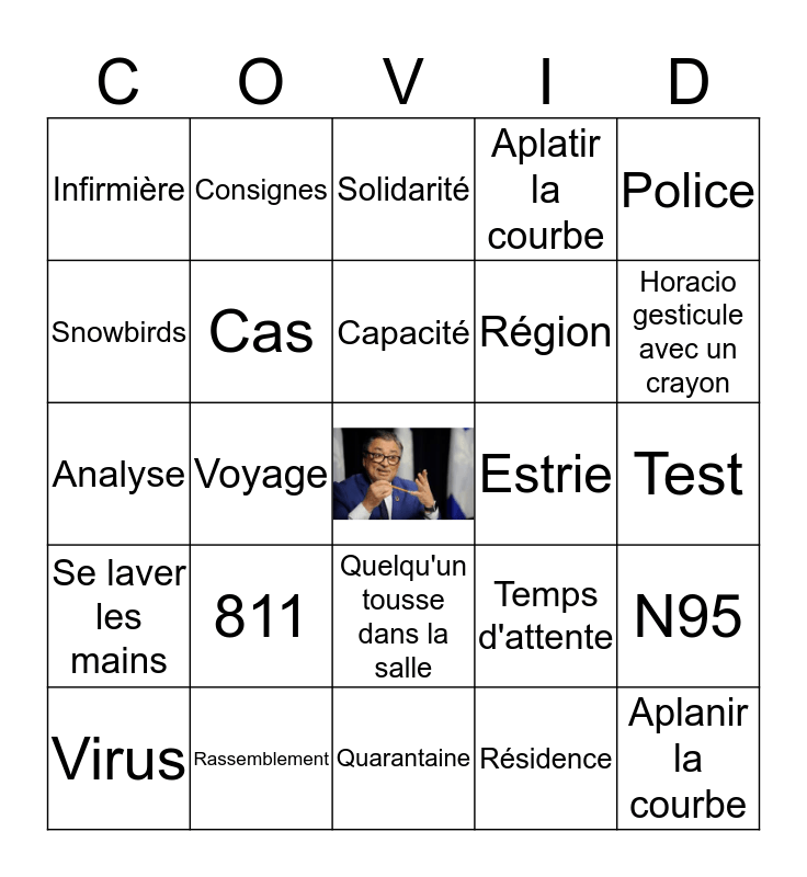 This bingo card has a free space and 29 words: Virus, Nos anges gardiens, Voyage, Docteur Arruda, Infirmière, Solidarité, Cas, 811, Estrie, Rassemblement, Test, Aplanir la courbe, Quarantaine, Résidence, Horacio gesticule avec un crayon, Lit, Quelqu'un tousse dans la salle, Se laver les mains, Police, Analyse, Temps d'attente, Chaque geste compte, Région, Snowbirds, Aplatir la courbe, Consignes, N95, Capacité and Granby.