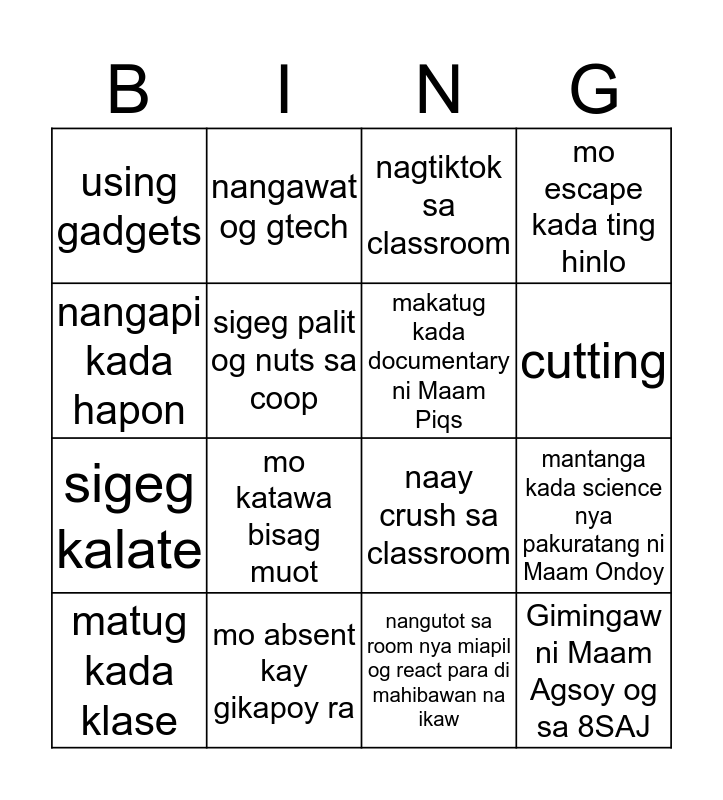 This bingo card has 16 words: mo absent kay gikapoy ra, mantanga kada science nya pakuratang ni Maam Ondoy, nagtiktok sa classroom, using gadgets, sigeg kalate, nangawat og gtech, naay crush sa classroom, nangutot sa room nya miapil og react para di mahibawan na ikaw, nangapi kada hapon, sigeg palit og nuts sa coop, matug kada klase, mo escape kada ting hinlo, mo katawa bisag muot, cutting, makatug kada documentary ni Maam Piqs and Gimingaw ni Maam Agsoy og sa 8SAJ.