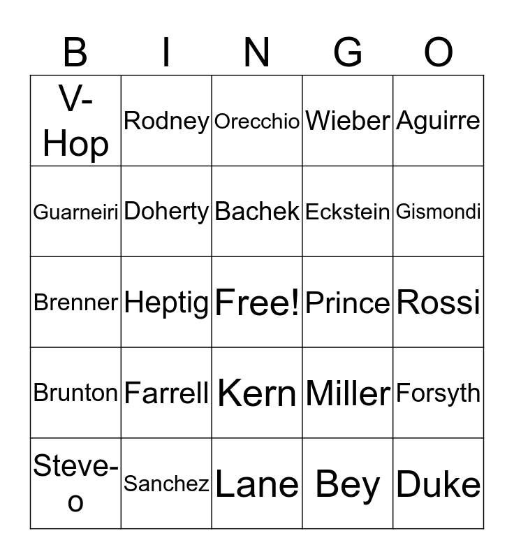 This bingo card has a free space and 29 words: Steve-o, Yanucci, Heptig, Perez, V-Hop, Orecchio, Doherty, Farrell, Prince, Sanchez, Rossi, Duke, Lane, Bey, Gismondi, Carl, Kern, Brunton, Aguirre, Brenner, Miller, Lananna, Eckstein, Guarneiri, Wieber, Rodney, Forsyth, Bachek and K. Johnson.