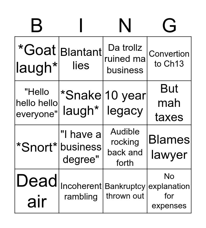 This bingo card has 16 words: Incoherent rambling, Blames lawyer, Da trollz ruined ma business, *Goat laugh*, *Snort*, Blantant lies, Audible rocking back and forth, Bankruptcy thrown out, "Hello hello hello everyone", *Snake laugh*, Dead air, Convertion to Ch13, "I have a business degree", But mah taxes, 10 year legacy and No explanation for expenses.