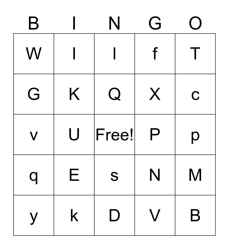This bingo card has a free space and 52 words: A, B, C, D, E, J, I, H, G, F, K, L, M, N, S, R, Q, P, O, T, U, V, W, X, Y, Z, a, b, c, d, e, f, g, h, m, l, k, j, i, n, o, p, q, r, s, t, u, v, w, x, y and z.